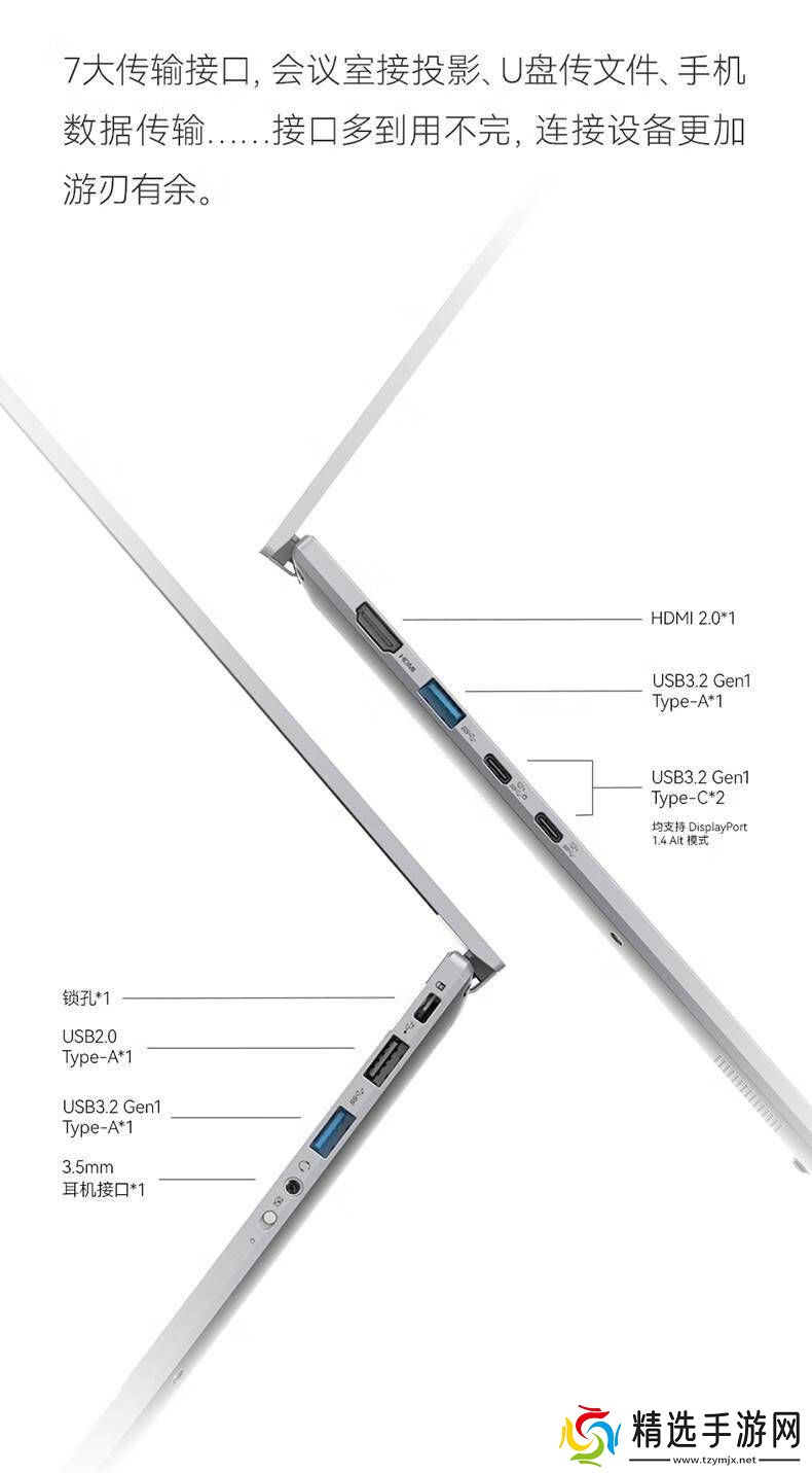 接口方面,惊鸿14 AI的左侧配备了HDMI 2.0、USB-A 5Gbps以及两个支持DP 1.4 Alt的USB-C 5Gbps接口;右侧则包含了安全锁孔、USB-A 480Mbps、USB-A 5Gbps和一个3.5mm二合一音频插孔。这些丰富的接口满足了用户在日常使用中的各种连接需求。
