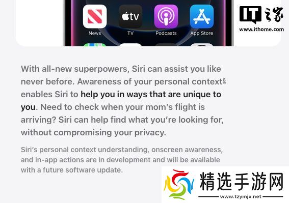 本站 3 月 12 日消息,苹果公司备受期待的 Apple Intelligence 中针对 Siri 的新功能已被无限期推迟,这些新功能原被认为是 iPhone 16 系列的一大亮点,但苹果在上周末已悄然撤下了一则展示 Siri“个人上下文”功能的 YouTube 广告。如今,苹果在其官网的 iPhone 营销页面上新增了一则免责声明,针对尚未发布的 Siri 功能进行了说明。