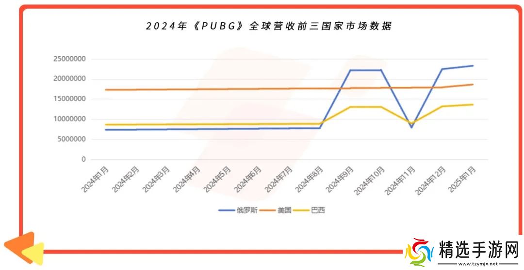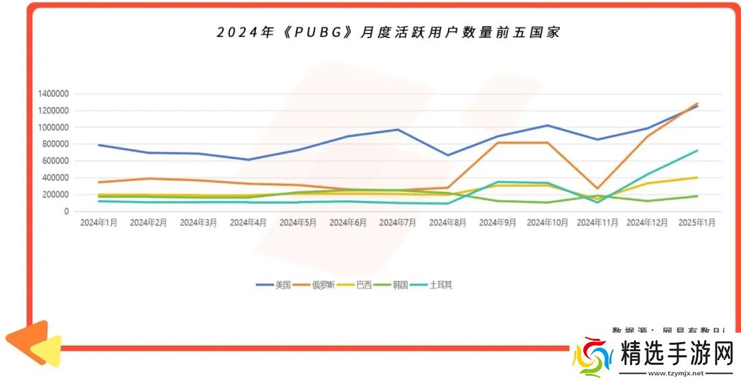 无独有偶,《PUBG》的传统市场与新兴力量的角力格局愈发清晰。美国以125万MAU(2025年1月)保持领先,但俄罗斯、土耳其、巴西等区域市场实现爆发式增长——俄罗斯MAU同比激增270%,土耳其用户规模一年内翻5倍,巴西突破40万大关。这一变化背后,是新兴市场通过移动端渗透、本土化运营与低成本电竞生态对全球游戏格局的重新定义。
