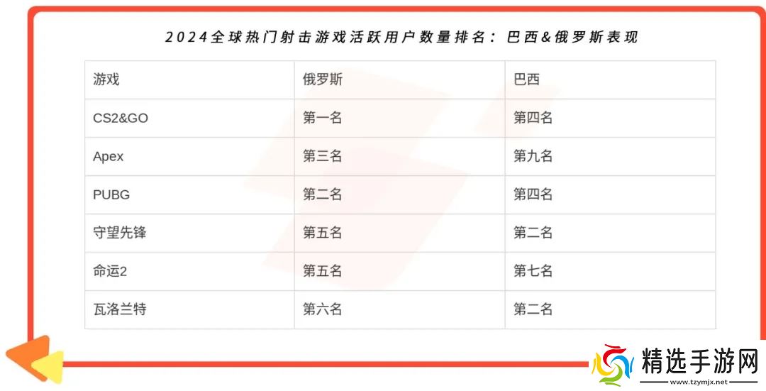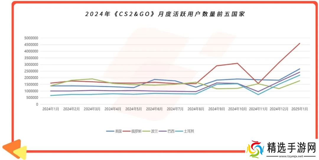 再说到世界范围内的射击游戏,以《CS2&GO》为例,这颗FPS界的常青树,美国市场虽以月均85.2万活跃玩家稳居第一,但俄罗斯、巴西、土耳其等新兴市场增速惊人——俄罗斯MAU同比暴涨187%,土耳其用户规模一年翻倍,巴西MAU突破240万。俄罗斯市场的MAU已经超越美国的267.5万的近2倍,达到459.6万。