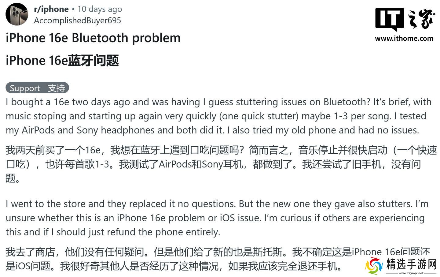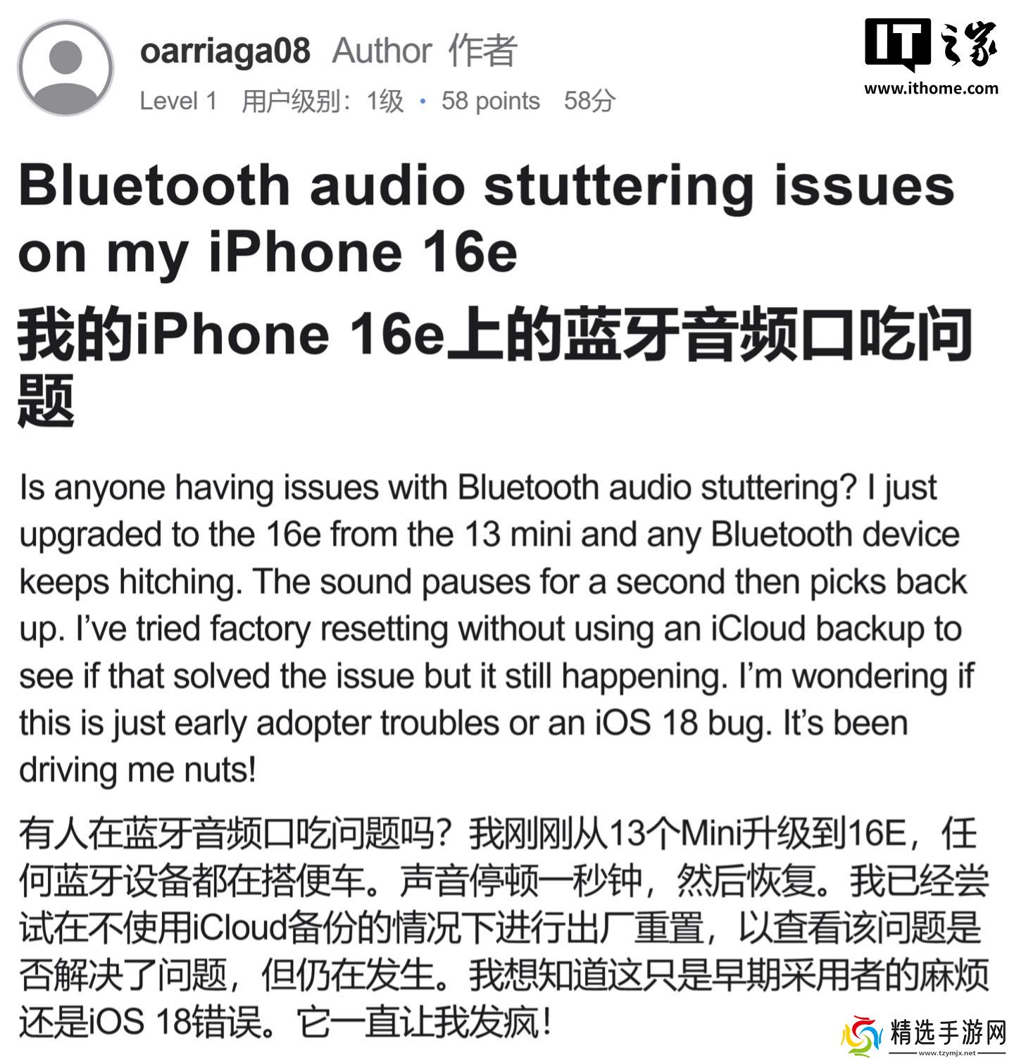 用户在 Apple 支持社区、Reddit 和 X 平台抱怨称,iPhone 16e 连接蓝牙音箱后,音频在播放过程中出现卡顿或中断,影响用户体验。本站附上相关截图如下: