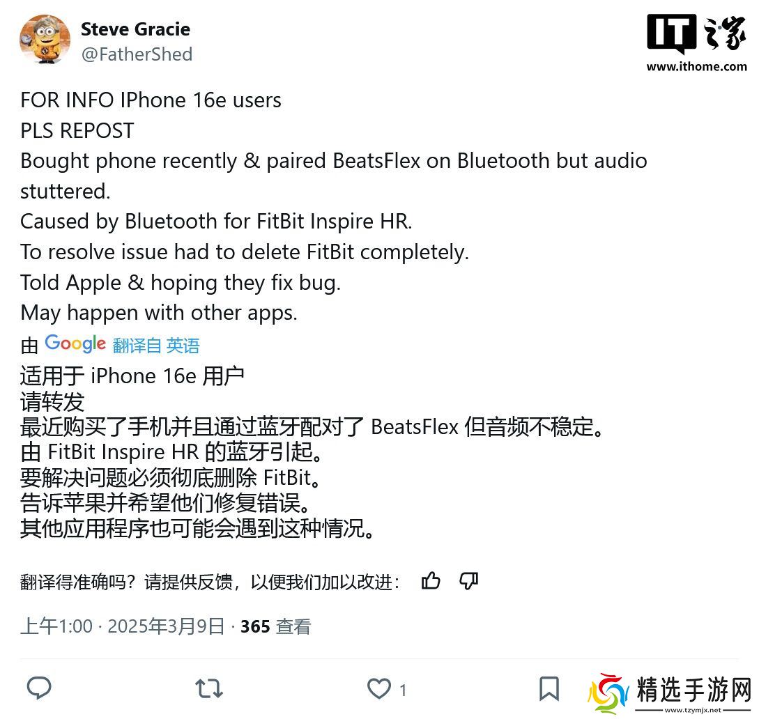 本站 3 月 14 日消息,科技媒体 MacRumors 昨日(3 月 13 日)发布博文,报道称在 iPhone 16e 发售 2 周后,部分用户反馈这款苹果最亲民 iPhone 存在蓝牙音频问题。