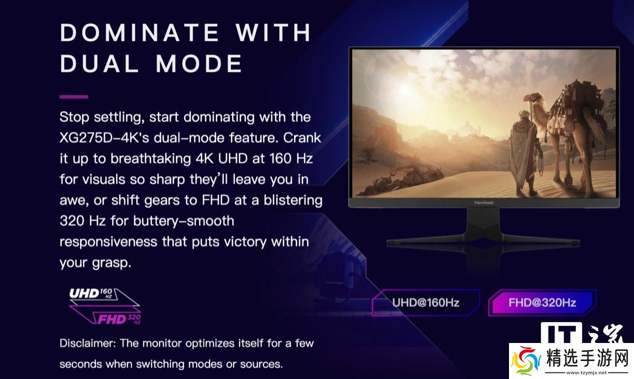 本站 3 月 20 日消息,优派(ViewSonic)近日于其海外官网上线了一款双模电竞显示器 XG275D-4K。该显示器支持在 4K 160Hz 及 1080P 320Hz 两种模式间切换,并适配 Xbox 及 PlayStation 5 游戏机。目前该显示器暂未在国内电商平台上线。