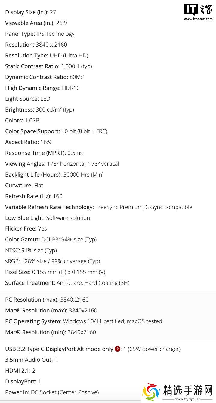 该显示器在 IO 接口方面,有一个 DC 电源接口、两个 HDMI2.1 接口、一个 DisplayPort 1.4 接口、一个 USB Type-C 接口,以及一个音频输出接口。Type-C 接口最大可提供 65W 的反向电源输出。