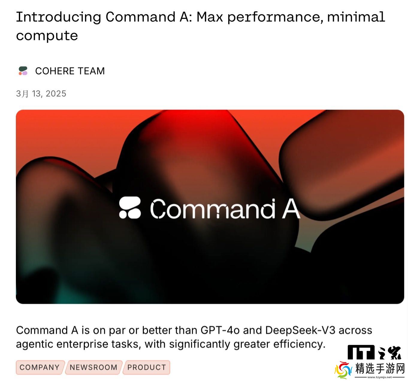 本站 3 月 14 日消息,加拿大 AI 初创公司 Cohere昨日发布了一款名为“Command A”的 AI模型,该模型主打轻量化应用,号称只需要两块英伟达 A100 或 H100 GPU 即可轻松部署,号称“表现能和 GPT-4o 相媲美”,实现“用最少的硬件发挥最大的性能”。