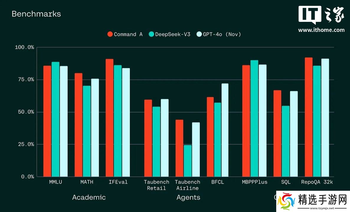 在性能测试中,Command A 最快每秒可以输出 156 个 Token,据称比 GPT-4o 快 1.75 倍。而在指令追踪、SQL、代理程序和工具任务的基准测试上,Command A 也表现出色。