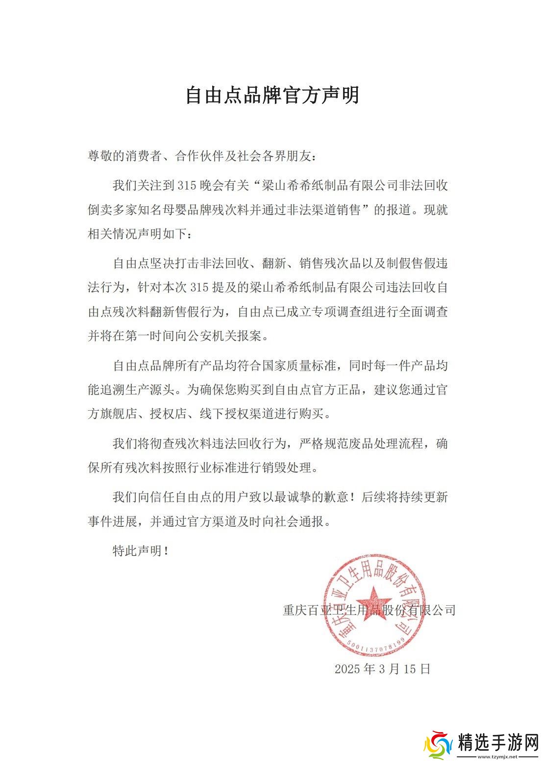 自由点坚决打击非法回收、翻新、销售残次品以及制假售假违法行为,针对本次 315 提及的梁山希希纸制品有限公司违法回收自由点残次料翻新售假行为,自由点已成立专项调查组进行全面调查并将在第一时间向公安机关报案。
