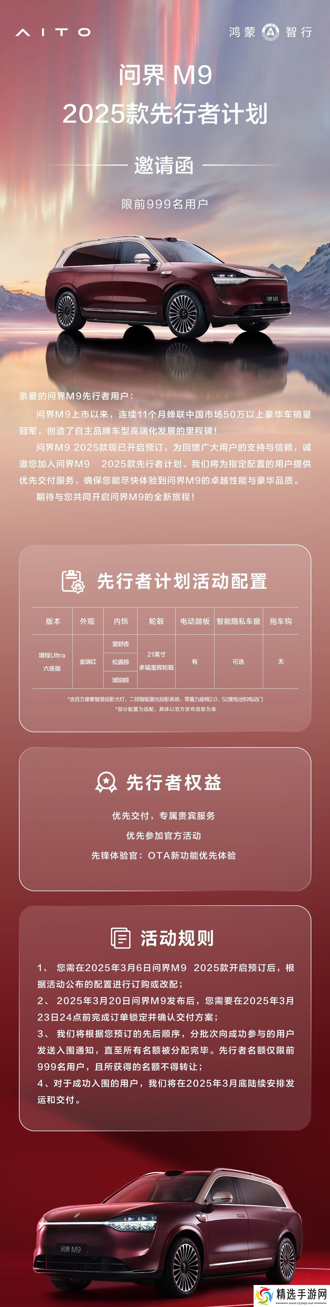 问界 M9 2025 款将于 3 月 20 日亮相,据本站昨日报道,官方宣布推出先行者计划,为指定配置的用户提供优先交付服务,限前 999 名用户。