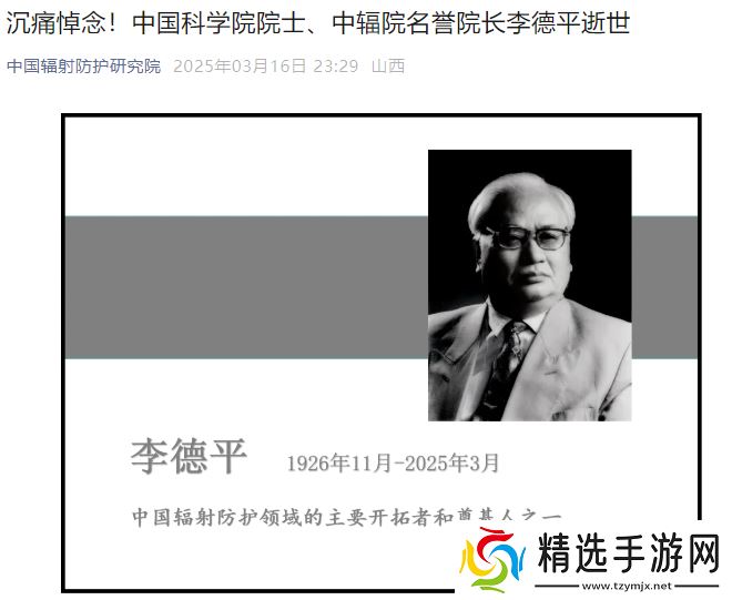 本站 3 月 17 日消息,3 月 16 日晚,中国辐射防护研究院发布讣告:中国科学院院士,中国核工业功勋奖章、全国科学大会奖获得者,第六、七、八、九届全国政协委员,中国辐射防护领域的主要开拓者和奠基人之一,国际著名辐射防护专家,中国辐射防护研究院原院长、名誉院长李德平,因病医治无效,于 2025 年 3 月 16 日 17 时 52 分在北京逝世,享年 99 岁。