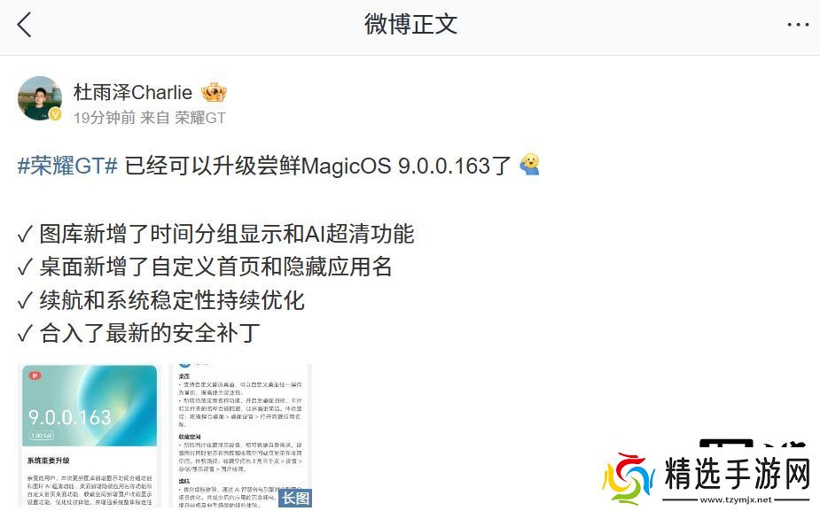本站 3 月 24 日消息,据荣耀 GT 系列产品经理@杜雨泽Charlie 今日分享,荣耀 GT 手机已开启 MagicOS 9.0.0.163 尝鲜升级,系统包大小约 1.00GB,新增图库时间分组显示和 AI 超清等功能。