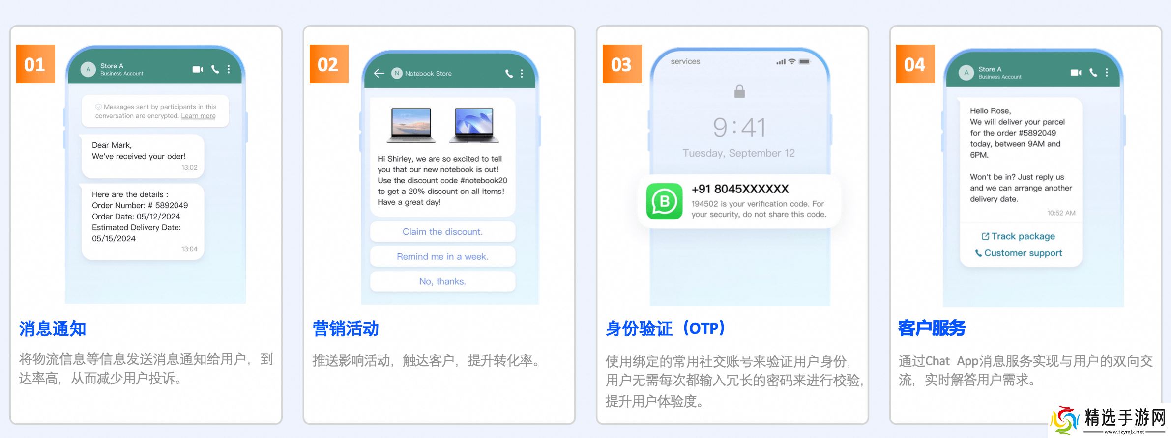 借助Chat App消息服务,企业能够在多个场景下通过WhatsApp消息触达用户,包括验证码及身份认证、商品推广、订单状态及物流通知以及客户关怀和客户服务等。这些功能极大地丰富了企业与用户的沟通方式,提升了沟通的效率和效果。