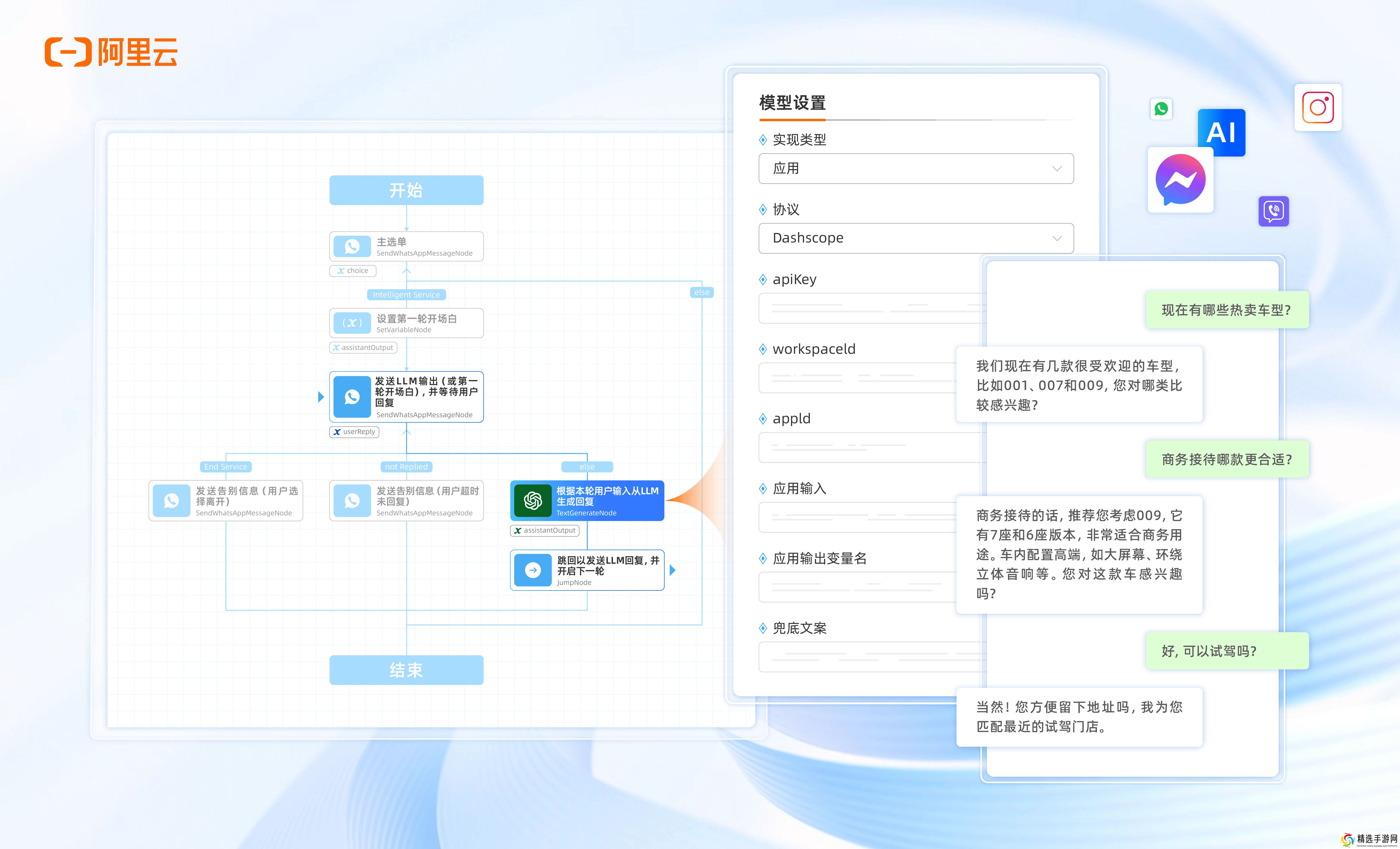 尤为本月阿里云Chat App宣布正式打通模型服务,企业可以接入主流的大语言模型、助理或智能体应用,并在WhatsApp的对话流程中完成嵌入。这意味着企业可以在无需编写任何代码的情况下,实现智能客服、智能导购、意向客户挖掘等场景的快速落地。