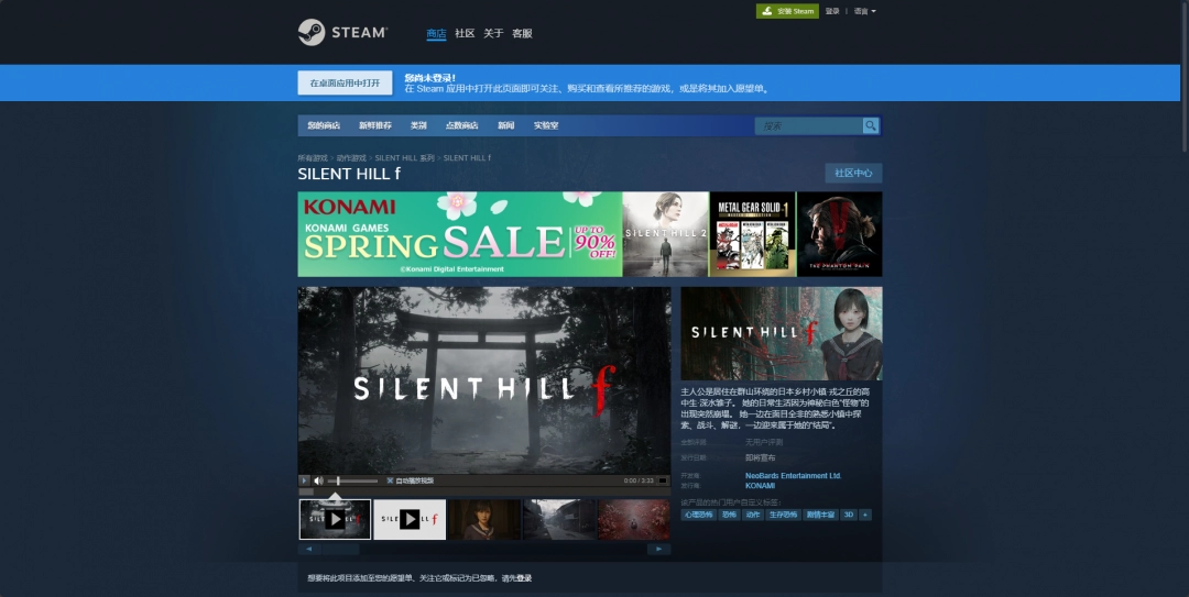《寂静岭f》是NeoBards Entertainment Ltd.制作、KONAMI发行的《寂静岭》系列的第八部正统续作,而这款游戏想要下载还是比较麻烦的,下载的第一步就是安装Steam平台,然后注册账号登录,并且搜索“SILENT HILL f”,然后点击购买,之后点马上开玩即可。