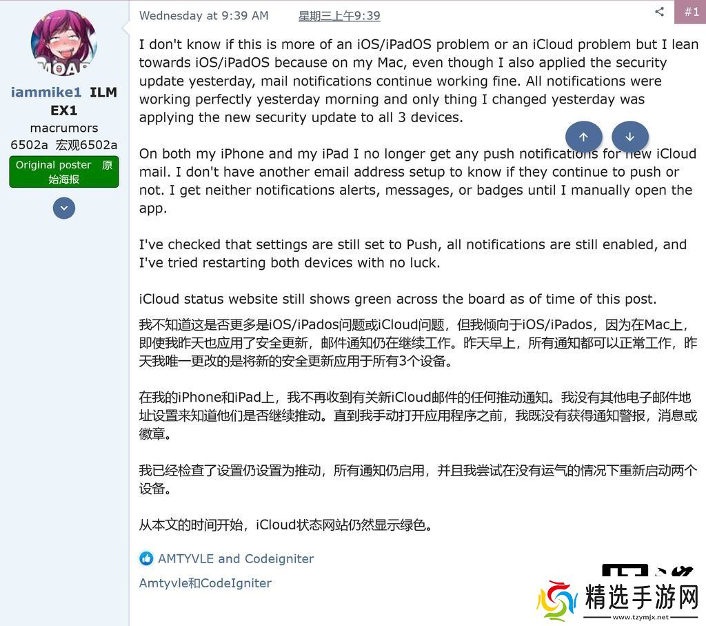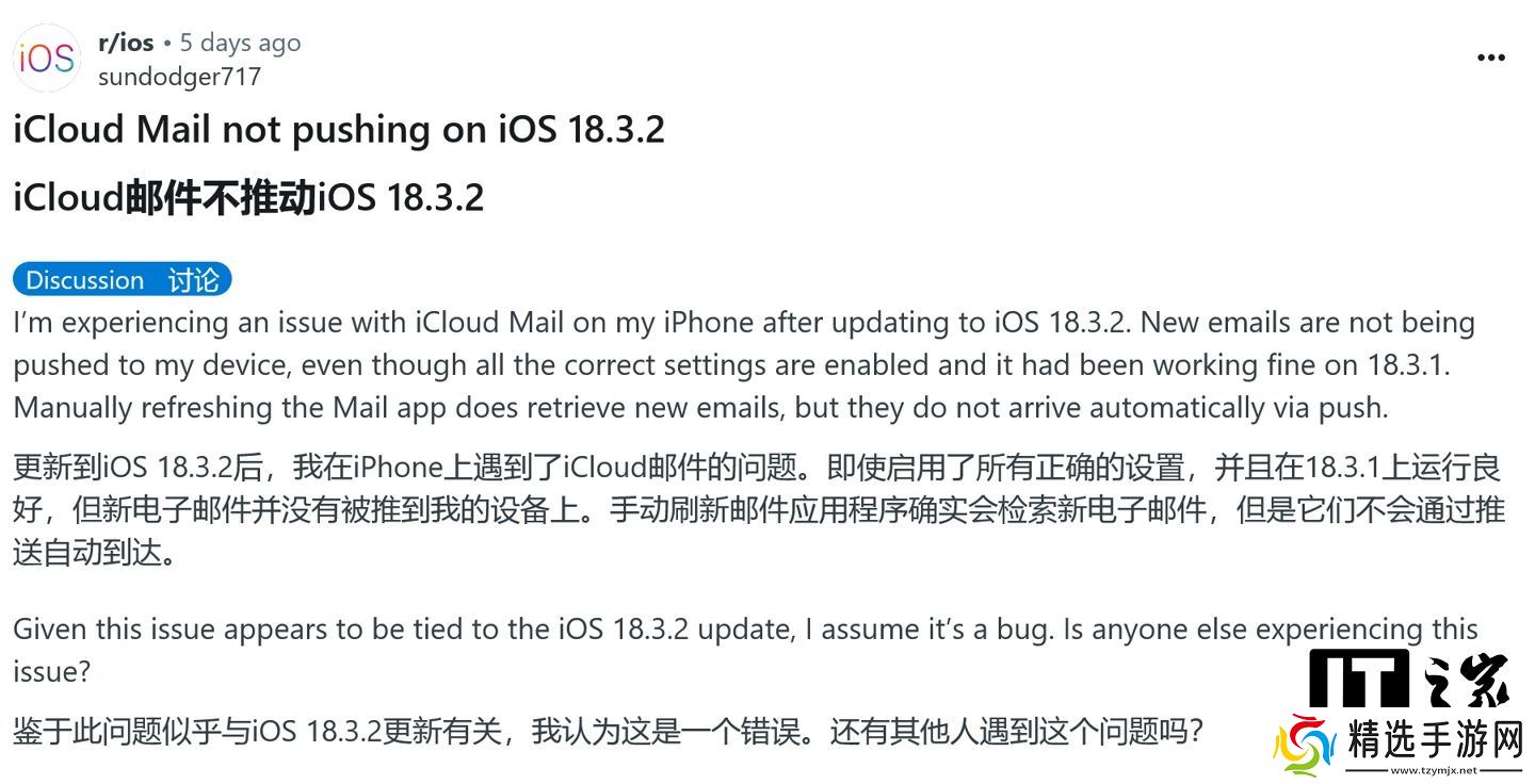 部分用户反馈升级 iOS 18.3.2 后,发现无法自动推送 iCloud 邮件。即使设置正常,新邮件也不会实时显示在收件箱,需手动刷新邮件应用才能查看。