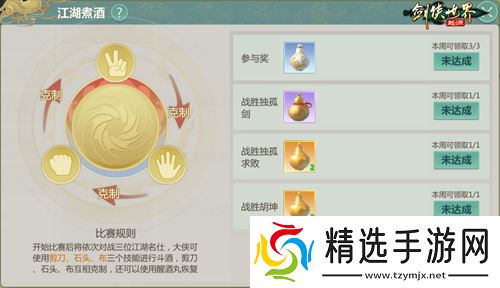 江湖煮酒不仅是对大侠们酒量和猜拳技巧的考验,更有丰厚的奖励等待着胜利者。每场游戏结束,无论输赢,参与的大侠均可获得一份参与奖励(每周最多领取三次)。而战胜其他江湖名仕,还可获得该名仕赠酒,使用后有机会获得银两、五行魂石、精铸石、玄晶等奖励。这些奖励均可在活动界面领取,让大侠们在斗酒中不仅享受豪情,更能收获实实在在的福利。
