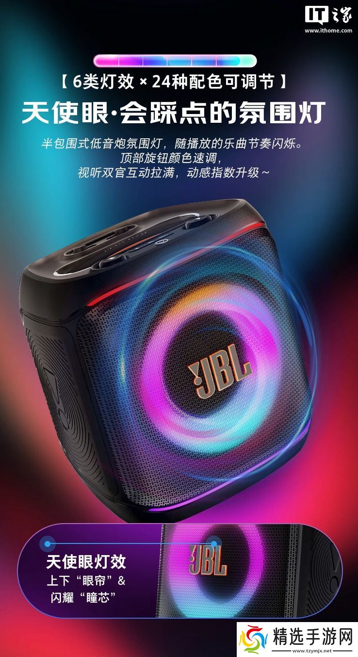 外观方面,这款音箱拥有24色可调节拍灯,支持根据歌曲匹配灯效,增加动感效果。音箱配备硅胶提手,号称“单手即可拎起”。
