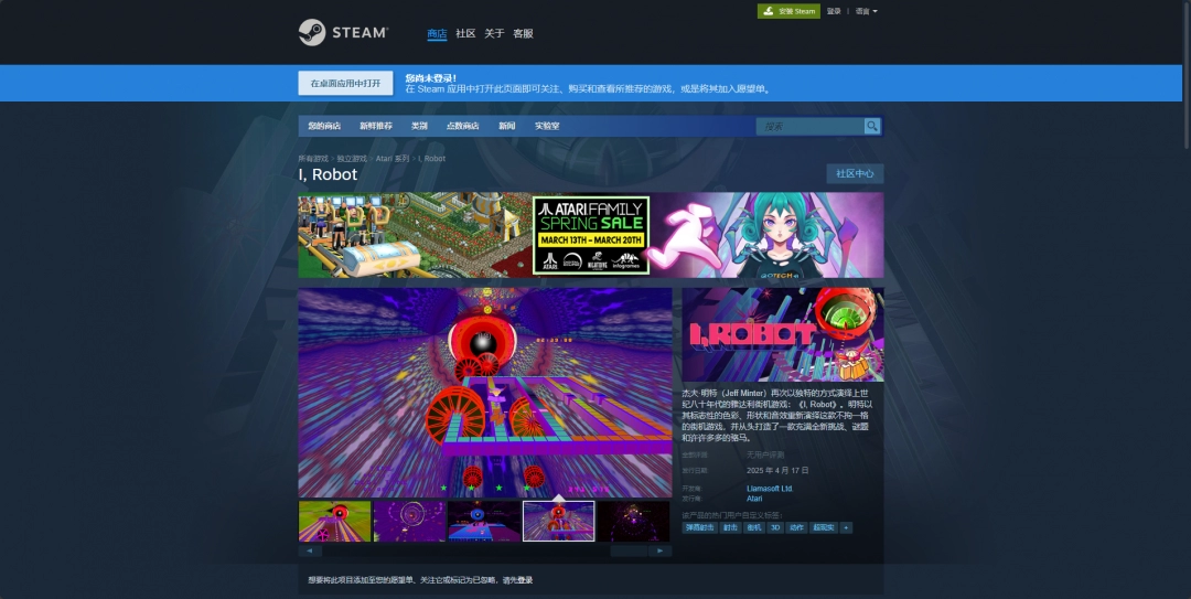 《我,机器人》是由Llamasoft Ltd.制作、Atari发行的80年代风街机游戏,而这款游戏想要下载还是比较麻烦的,下载的第一步就是安装Steam平台,然后注册账号登录,并且搜索“I, Robot”,然后点击购买,之后点马上开玩即可。