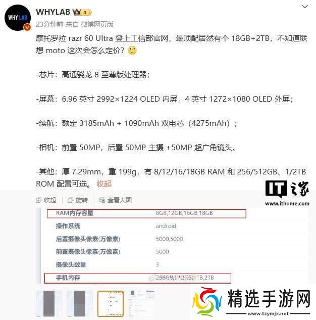 根据曝光的页面信息,这款摩托罗拉moto razr 60 Ultra在尺寸与重量上表现出色,机身尺寸为171.48×73.99×7.29mm,重量控制在199g,既保证了便携性又不失手感。其外屏分辨率为1080×1272,尺寸为4.0英寸,而内屏则达到了6.96英寸,分辨率为1224×2992,两块屏幕均支持10.7亿色显示,为用户带来细腻且丰富的色彩体验。