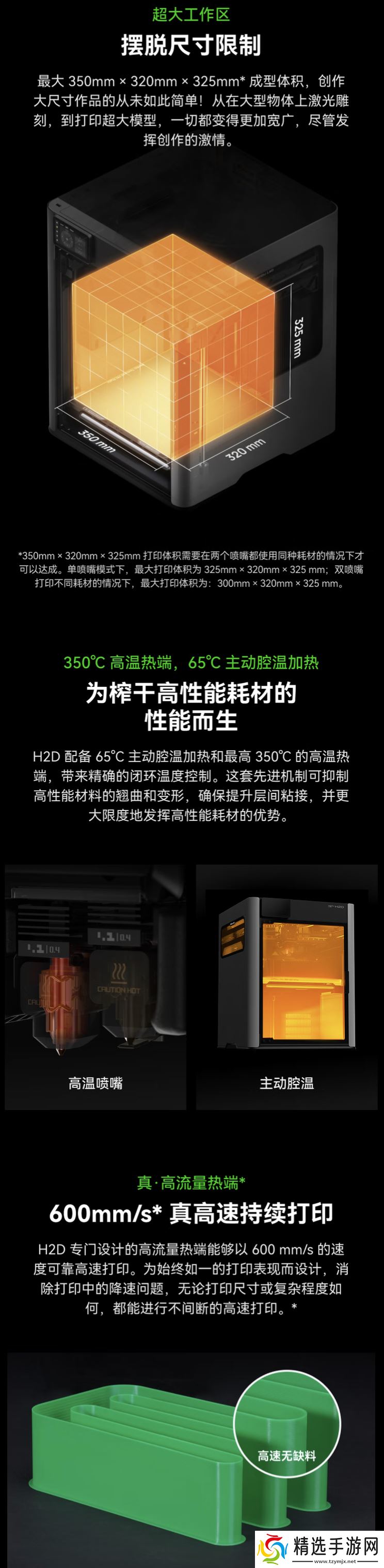 规格方面,这款 3D 打印机至多可打350mm x 320mm x 325mm空间体积物品,持续打印速度600mm/s,同时支持 AI全自动监控打印技术。