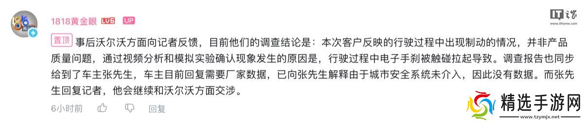 本站从节目后续跟进获悉,沃尔沃方面在今日回应称:“本次客户反映的行驶过程中出现制动的情况,并非产品质量问题,通过视频分析和模拟实验确认现象发生的原因是,行驶过程中电子手刹被触碰拉起导致。”对于此回应,张先生表示并不满意,他将会与沃尔沃方面继续交涉。