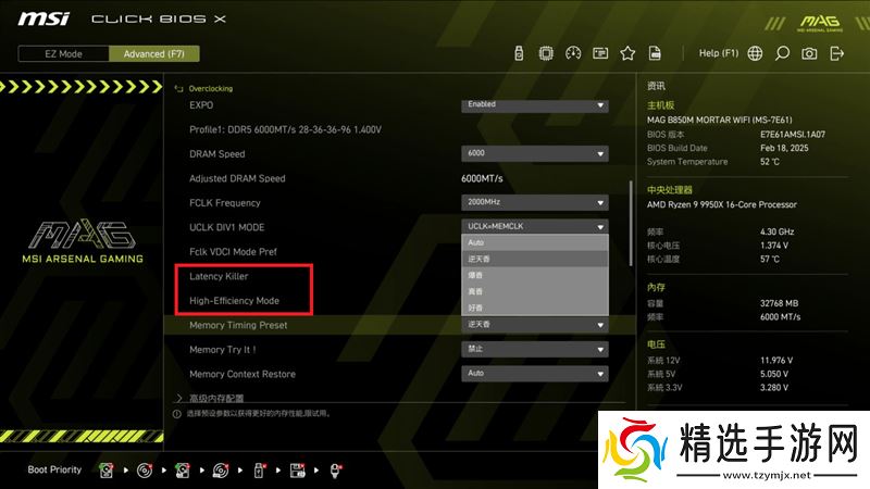 首先,B850M迫击炮搭载了全新的BIOS系统,引入了温控模式(Set Thermal Point)、性能切换设置(Performance Switch)和延迟杀手(Latency Killer)三大优化功能。其中,“内存高效能模式”尤为引人注目,它能够显著降低内存延迟,提升系统整体性能。