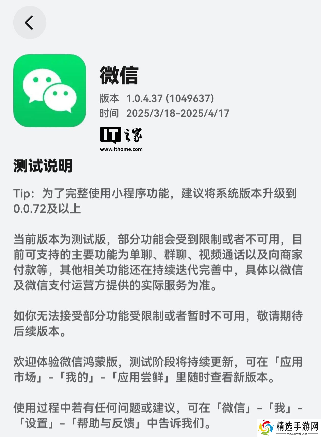 本站 3 月 18 日消息,鸿蒙原生版微信 App 今日在华为应用市场(App Gallery)开启 1.0.4.37(1049637)版本邀测升级(需收到短信通知后跳转安装),测试时间为 2025/3/18 - 2025/4/17。