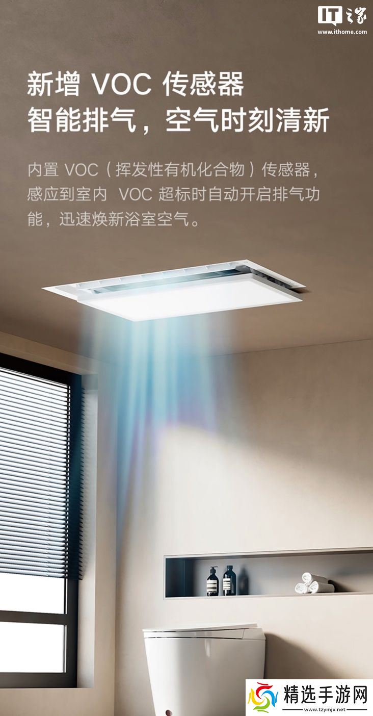 该浴霸配备Nidec品牌电机,每小时换气量254 立方米,支持2分钟整屋换气,浴霸同时内置VOC(挥发性有机化合物)传感器,在感应到室内相应化合物超标时将自动开启排气功能,更换浴室空气。