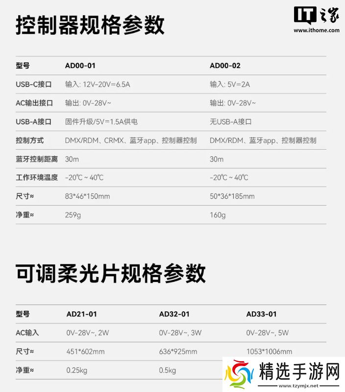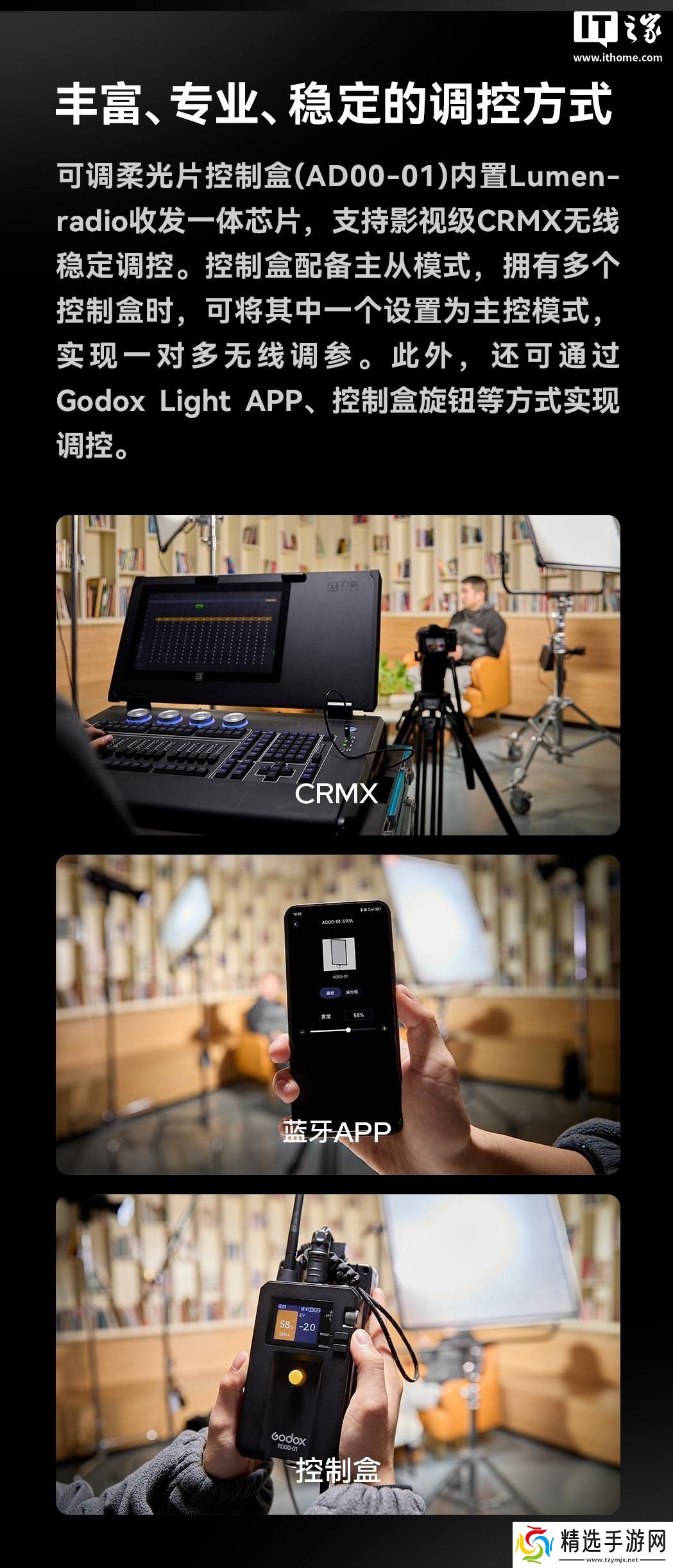 在调控方式方面,该系列可调柔光片的控制盒(AD00-01)内置 Lumen- radio 收发一体芯片,支持影视级 CRMX 无线稳定调控,此外还支持手机 App、控制盒旋钮等方式调控。