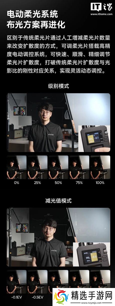 根据神牛官方介绍,该系列可调柔光片区别于传统柔光片通过人工增减柔光片数量来改变光扩散度的方式,搭载电动调控系统,可一键调节柔光片扩散度,拥有级别模式和减光值两种调控模式,级别模式可在 0~100% 的百分比值之间可视化快速调节,减光值模式支持-0.1~-2.0EV 的调控,更贴合专业用户的习惯,实现灵活动态调控。