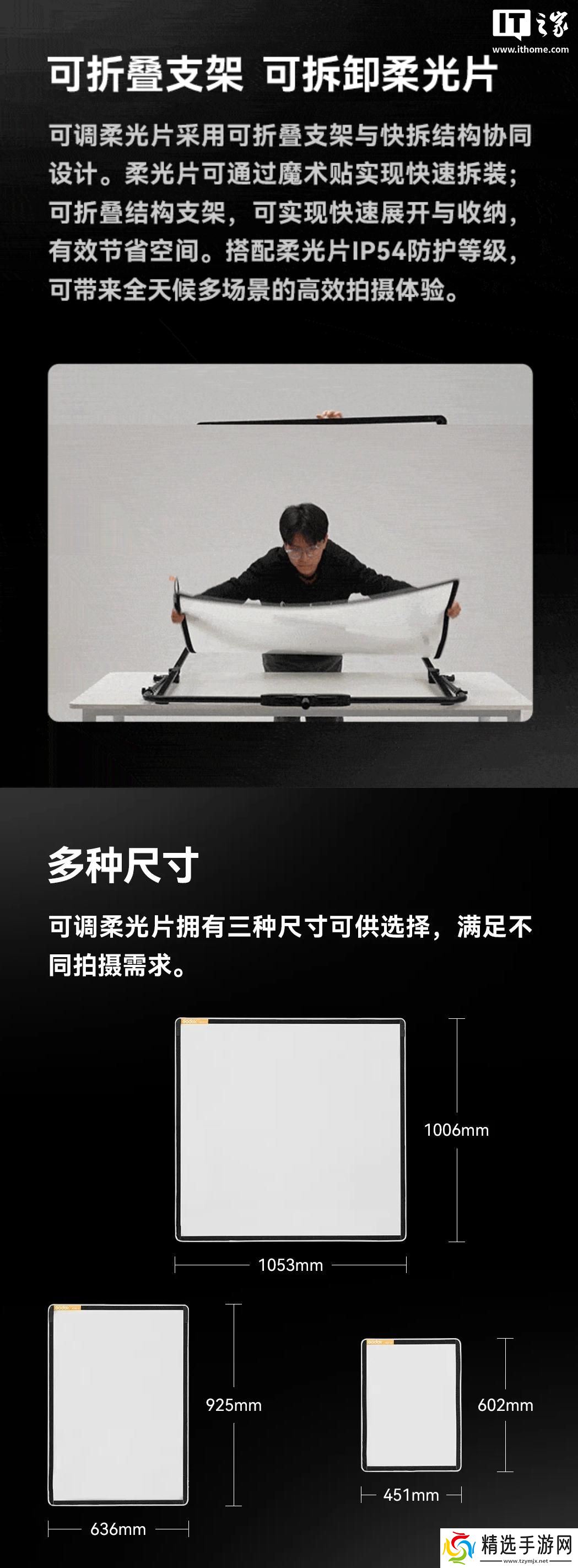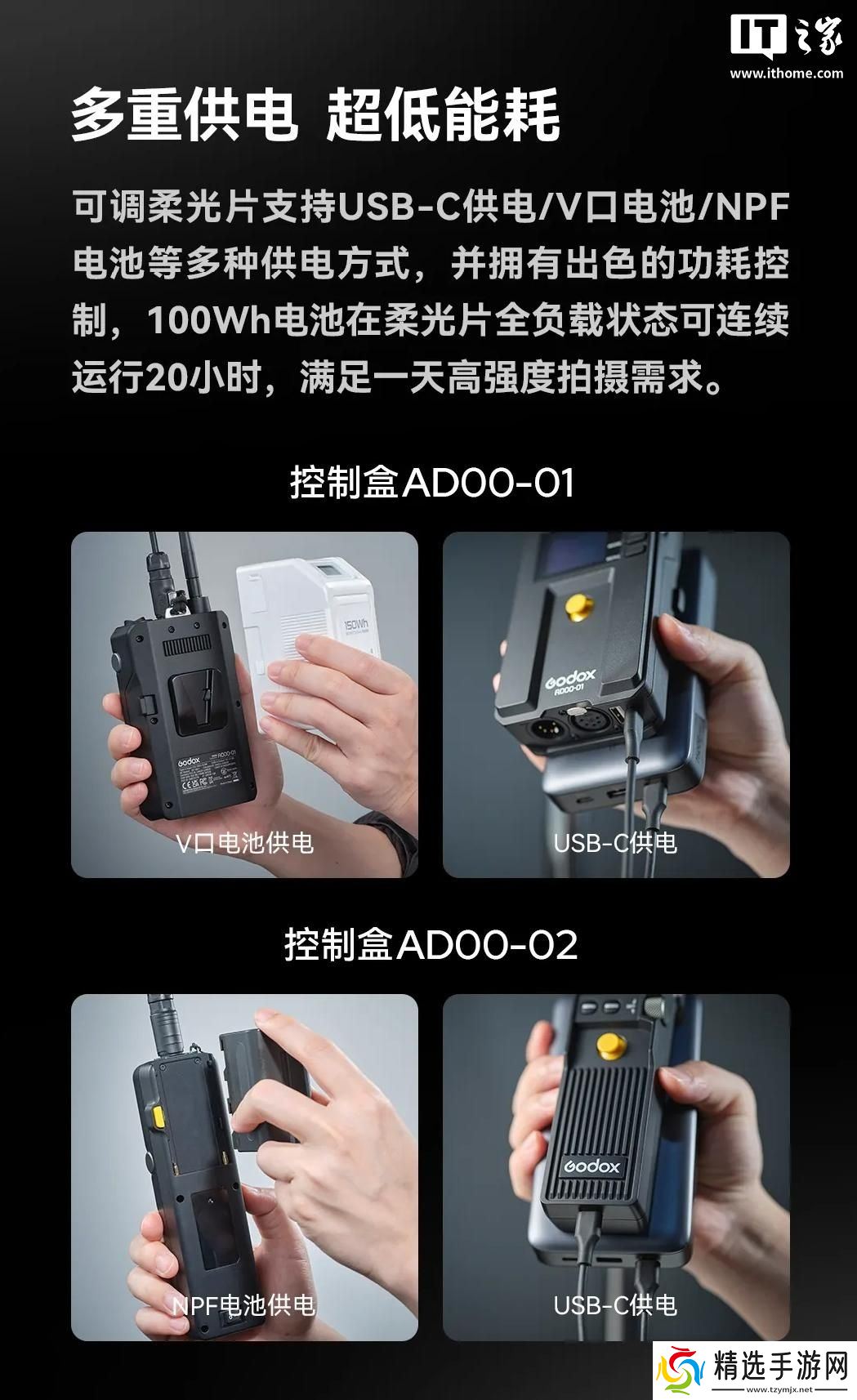 在供电方面,该系列可调柔光片拥有 USB-C 供电、V 口电池和 NPF 电池等多种供电方式,根据官方介绍,使用 100Wh 的电池在柔光片全负载状态下可连续运行 20 小时,可满足一天的高强度拍摄需求。