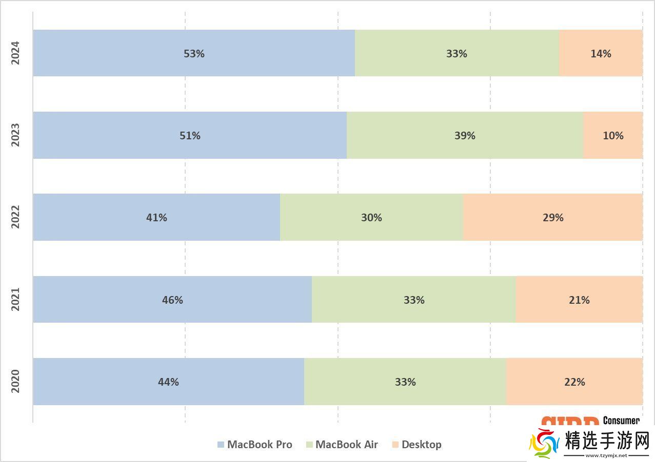 CIRP 数据显示 2024 年在美国市场,MacBook 占苹果 Mac 电脑总销量的 86%,其中 Pro 系列长期领跑,比重为 53%。