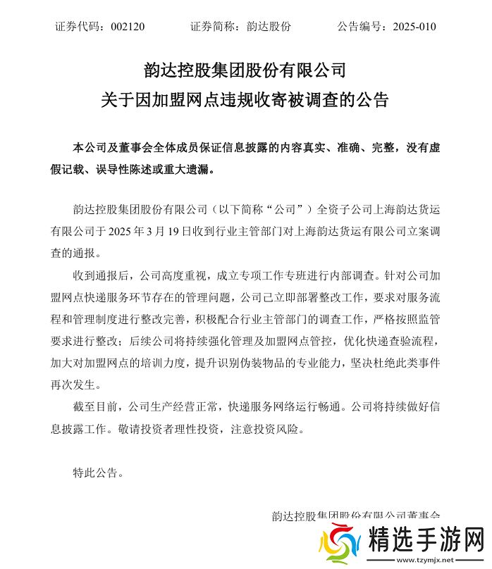 本站 3 月 20 日消息,韵达控股集团股份有限公司今日发布公告,全资子公司上海韵达货运有限公司于 2025 年 3 月 19 日收到行业主管部门对上海韵达货运有限公司立案调查的通报。