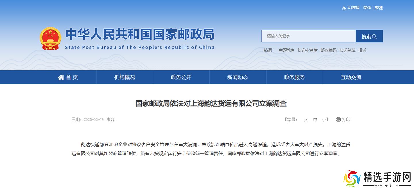 韵达快递部分加盟企业对协议客户安全管理存在重大漏洞,导致涉诈骗宣传品进入寄递渠道,造成受害人重大财产损失。上海韵达货运有限公司对其加盟商管理缺位,负有未按规定实行安全保障统一管理责任,国家邮政局依法对上海韵达货运有限公司进行立案调查。