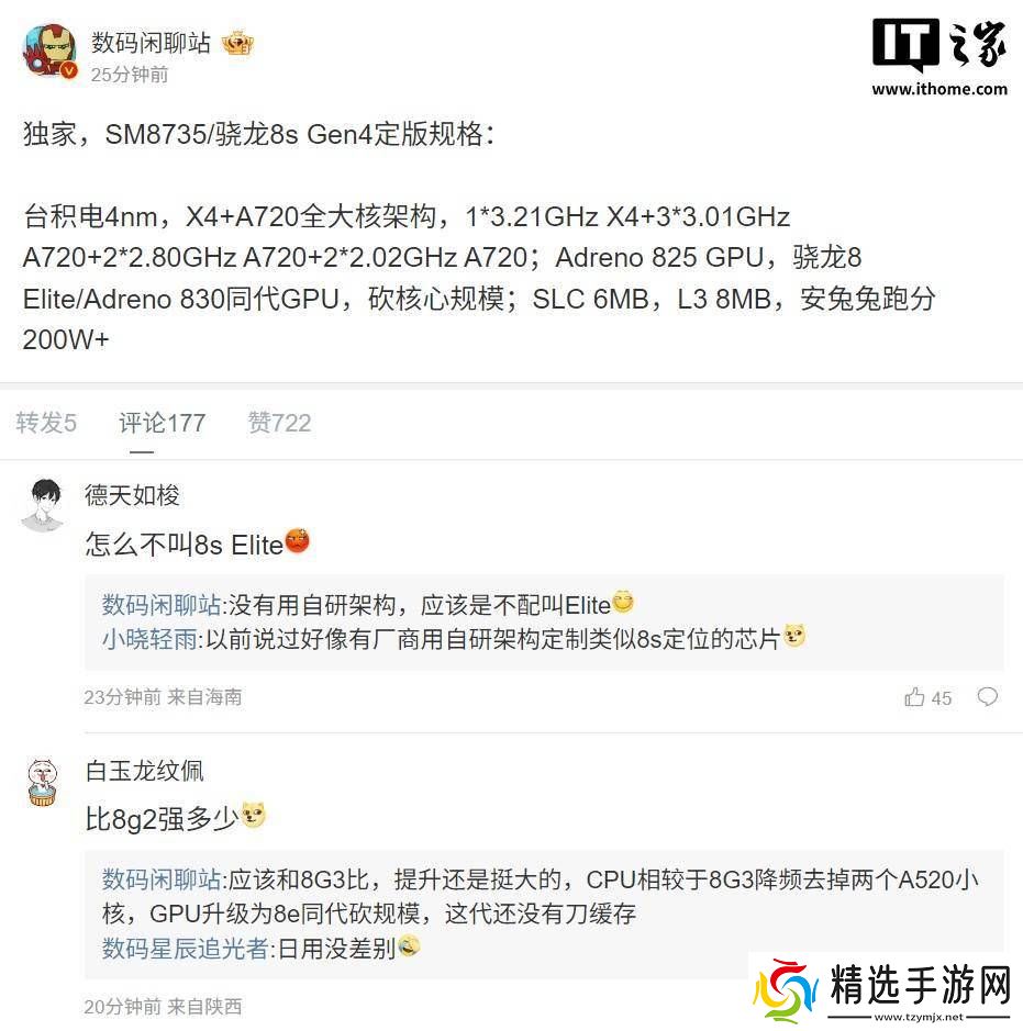 近期,知名数码博主@数码闲聊站分享了高通骁龙8s Gen 4处理器(型号为SM8735)的最终规格详情,引起了广泛关注。
