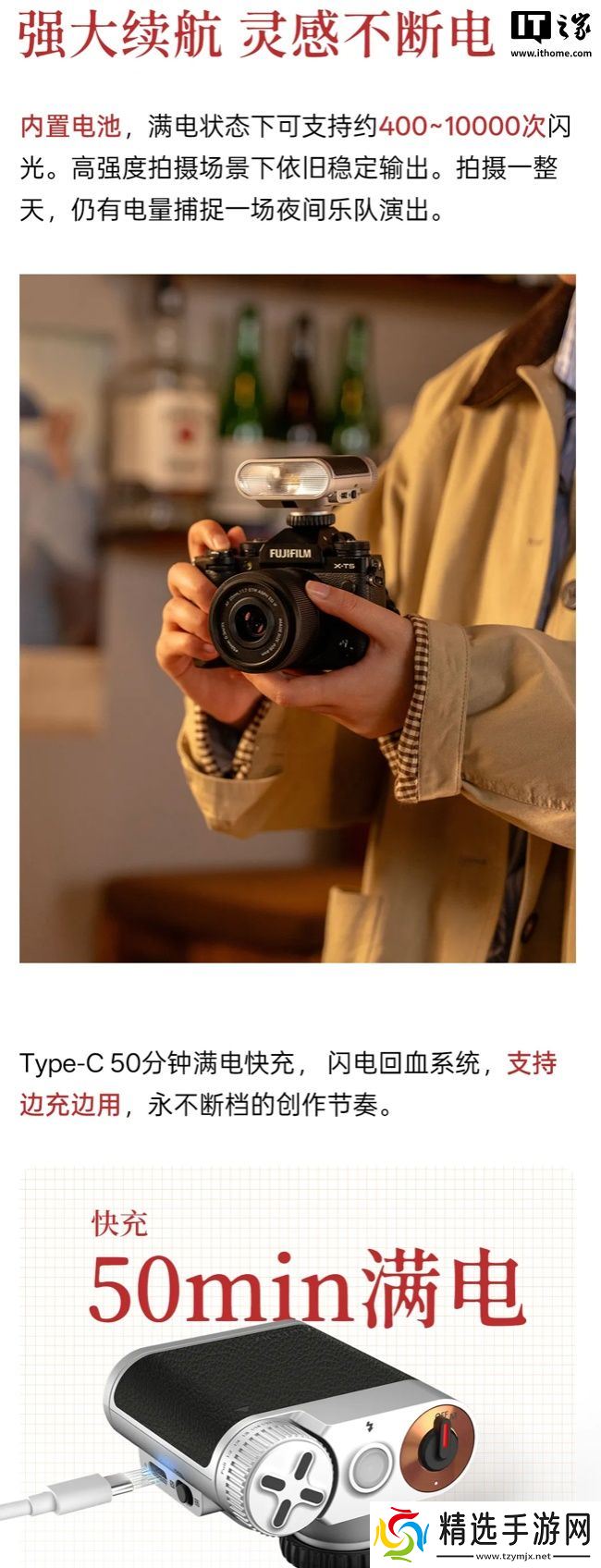 在参数方面,该闪光灯闪光指数 GN12,内置 7 档亮度模式,从 1/64-1/1,回电速度 0.2 秒-3.5 秒,闪光持续时间(T 0.5)1/5000 秒-1/50000 秒;内置两种光引闪模式,S1 模式可实现无线离机触发闪光灯,S2 模式可实现防预闪模式,在多灯协作时可规避频闪干扰;采用内置电池设计,满电状态下可支持约 400-10000 次闪光,充电口为 USB-C,可实现 50 分钟充满电,支持边充边用。