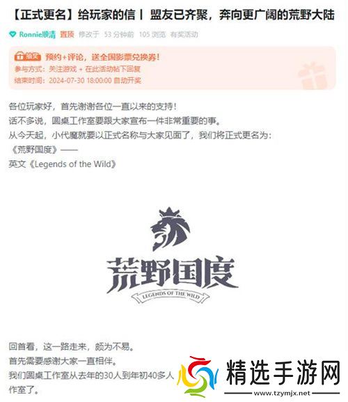 7月24日,TapTap上有一款8.9分的高分新游戏《代号:魔法与策略》宣布即将由儒意景秀代理,并更名为《荒野国度》。在制作人亲自发布的帖子中表示产品即将在7.25日正式开启预约,同时对一直以来支持《代魔》的玩家表达衷心感谢。