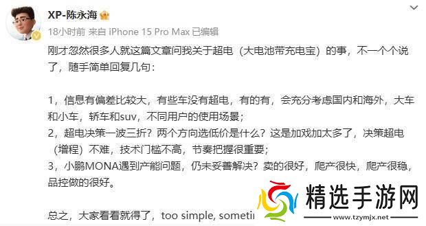 陈永海在回应中表示,目前报道中的信息存在较大偏差,小鹏汽车在规划增程车型时会充分考虑国内外市场需求。他坦言,从技术角度来看,增程技术的门槛并不高,但关键在于节奏的把握。陈永海还透露,小鹏MONA车型市场表现强劲,产量稳步攀升,且品控表现出色。