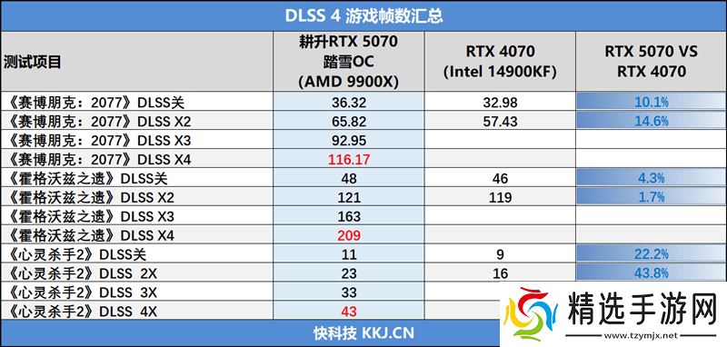 在性能测试中,耕升RTX 5070踏雪OC显卡展现出了强劲的实力。在3DMark的各项测试中,其成绩均较上一代产品有了显著提升,平均提升约30%。特别是在DLSS 4测试中,耕升RTX 5070踏雪OC显卡更是大放异彩,在《赛博朋克:2077》、《霍格沃兹之遗》和《心灵杀手2》等游戏中,开启DLSS 4后,帧率提升显著,最高可达435.42%。