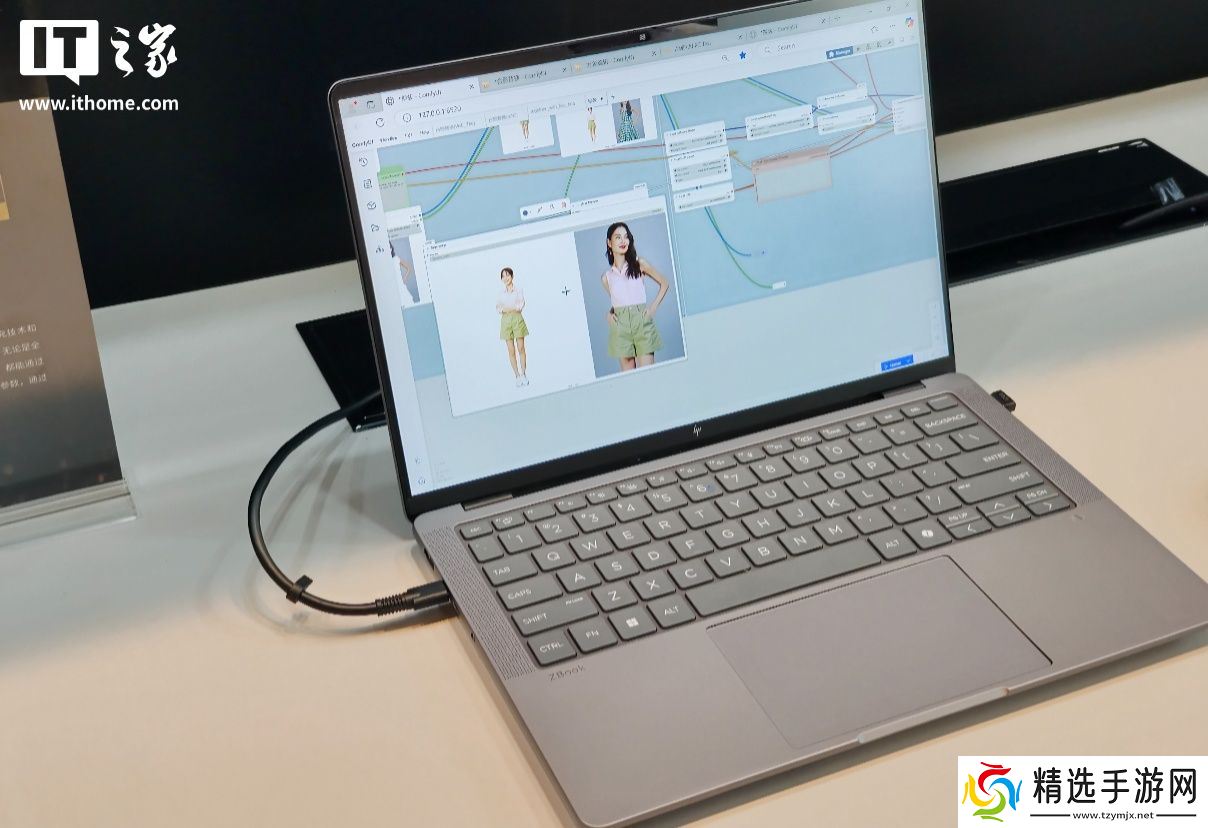 还有搭载 AMD 锐龙 AI Max+ PRO 395 移动处理器的惠普战 99 Ultra 锐龙版演示了运行 AMD Creative studio 的体验。ACE++ 是阿里开源的基于指令的图像创作与编辑工具,依托上下文感知填充技术和 FLUX.1-Fill-dev 算法,仅凭一张图即可生成风格一致的新图,无需额外训练。在演示中,现场工作人员展示了使用该算法的模型将 A 图片中的衣服无缝替换到 B 图片中的女生身上,得益于 Strix Halo 大显存优势,运行 12B 参数的模型完成这些步骤只用了 1 分多钟的时间。