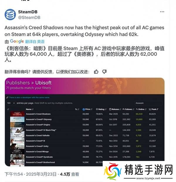 这一数字不仅超越了2018年发布的《刺客信条:奥德赛》在Steam上的62069人在线峰值记录,也使得《刺客信条:影》成为了该系列在Steam平台上最受欢迎的作品。这一成绩的取得,无疑为育碧公司带来了不小的鼓舞。