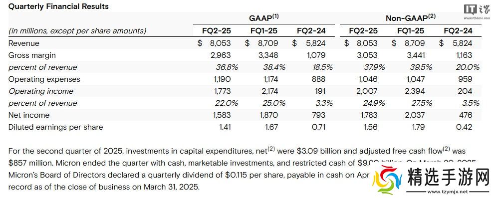 本站 3 月 21 日消息,美光科技公司今日公布了截至 2025 年 2 月 27 日的 2025 财年第二季度业绩:
