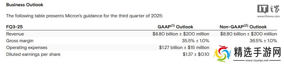 展望 2025 财年第三季度,美光预计营收可达80 亿美元(现汇率约合 578.59 亿元人民币),上下浮动 2 亿美元;GAAP 和非 GAAP 毛利率均为 36.5%,上下浮动 1%。