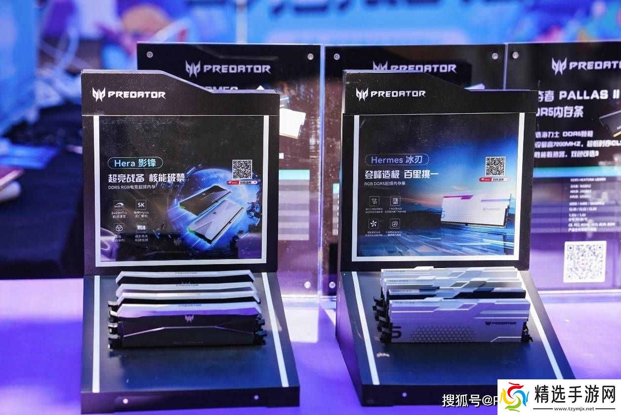 在内存展区,宏碁掠夺者的Hermes DDR5内存条同样吸引了众多目光。这款内存条采用特挑海力士颗粒,最高运行频率可达8400MT/s,支持XMP 3.0和AMD EXPO双平台超频方案。其绚丽的RGB灯效和2mm厚散热马甲,不仅提供了稳定的性能,还兼具了视觉美感。