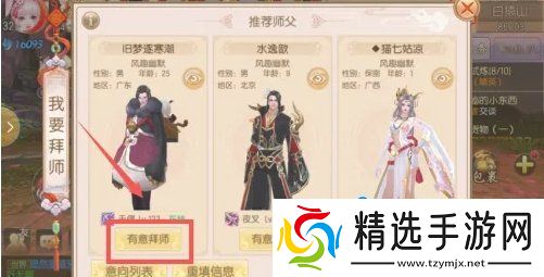 5、系统会根据我们的要求推荐师父,选择师父列表下的有意拜师;
