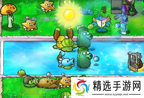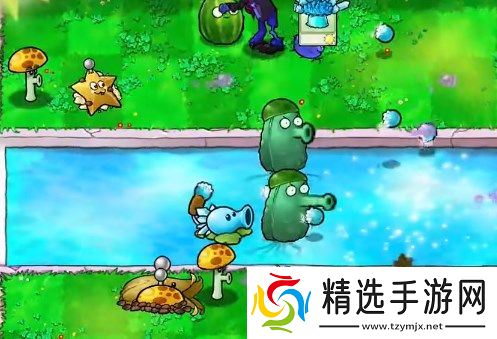 1、本关无需玩家选择植物,只需要使用天上掉下来的植物即可。2、先在泳池中种植两个海坚果,在草坪下方建造一个地刺大嘴花。