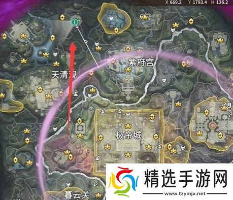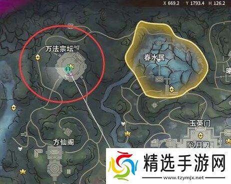 1、这个万法宗坛在最高比例地图上是不显示的,具体位置在极帝城左上角这一片。