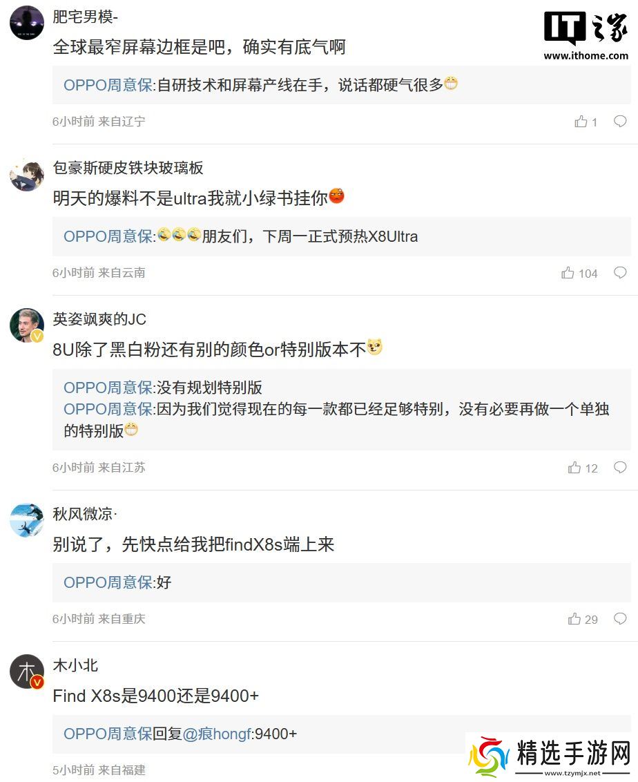 周意保今日在自己的微博评论区回复了部分网友的问题,并透露部分新品信息:针对 Find X8s 的处理器信息,他直接揭晓谜底“9400+”(此处预计指天玑 9400+);针对 Find X8 Ultra 手机是否会推出特别版机型,他回复“没有规划特别版”;针对 s + 和 Pro 的定位谁更高的问题,他表示“Pro 更高”。