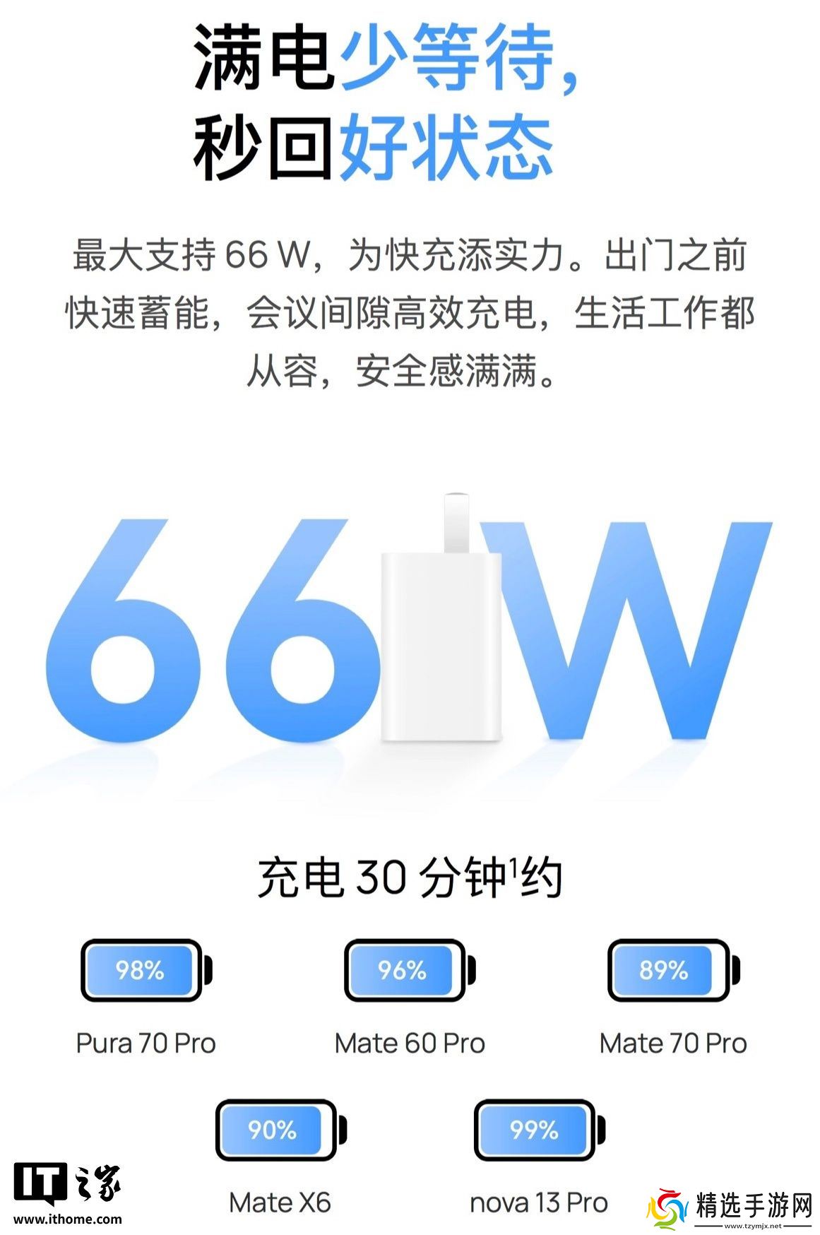 京东华为 66W 冰糖全能充电器 179 元直达链接根据华为官网介绍,该充电器最大支持 66W 功率快充,在手机电量 2% 的情况下,充电 30 分钟后可将华为 Pura 70 Pro 充至 98%,Mate 70 Pro 可充至 89%。该充电器采用 GaN 氮化镓技术,防干涉插脚设计,小巧不占插座。该充电器不同于以往的华为充电器,采用了全新的单 C 口设计。
