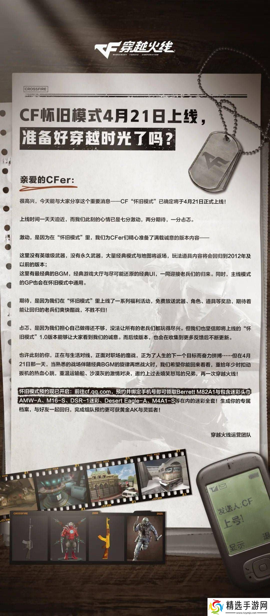 腾讯旗下热门第一人称射击游戏《穿越火线》近日宣布了一项令老玩家激动不已的消息:国服将推出怀旧模式,该模式定于4月21日正式上线。这一消息瞬间点燃了玩家们的热情,大家纷纷期待能够重温昔日的游戏时光。