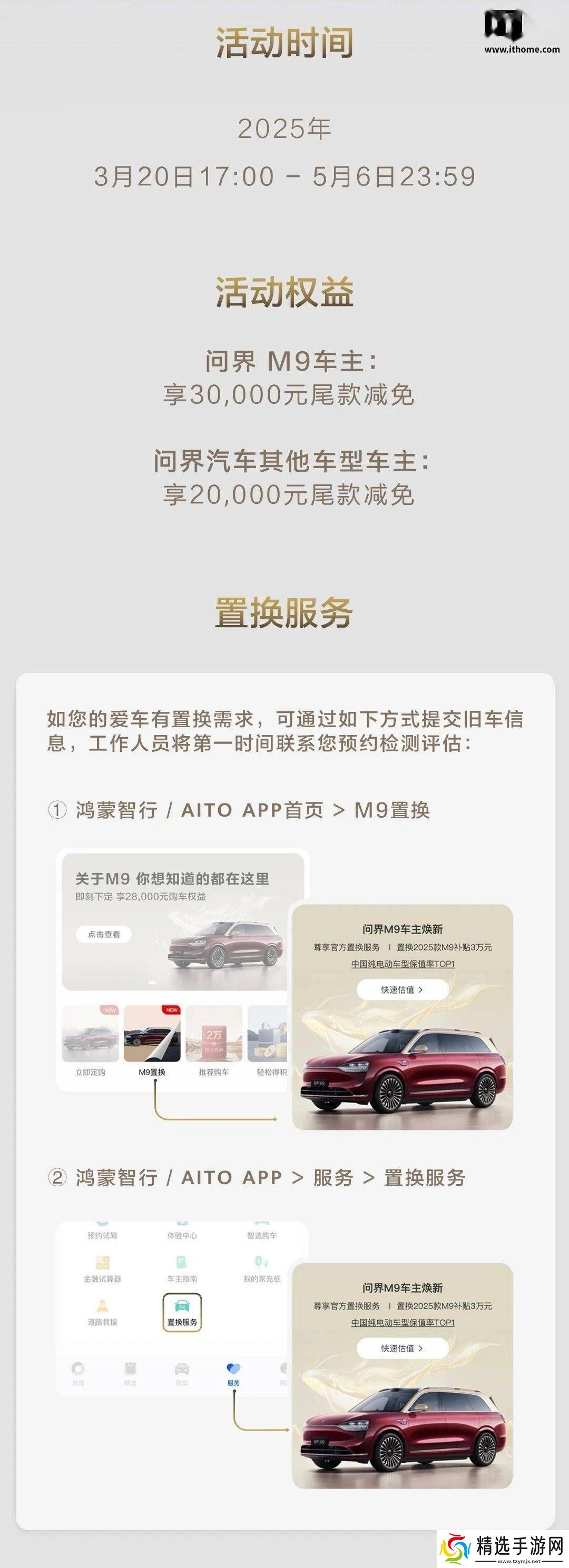 据悉,问界M9的官方置换服务活动时间跨度较长,从2025年3月20日17:00起,至5月6日23:59结束。活动期间,问界M9车主将享受到高达30,000元的尾款减免优惠,而其他问界汽车车型的车主也能获得20,000元的尾款减免。这一优惠力度,无疑是对现有车主的一种回馈和激励。